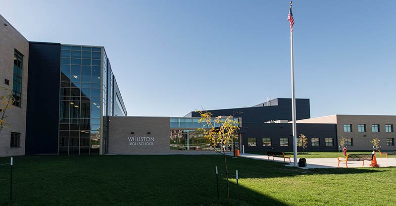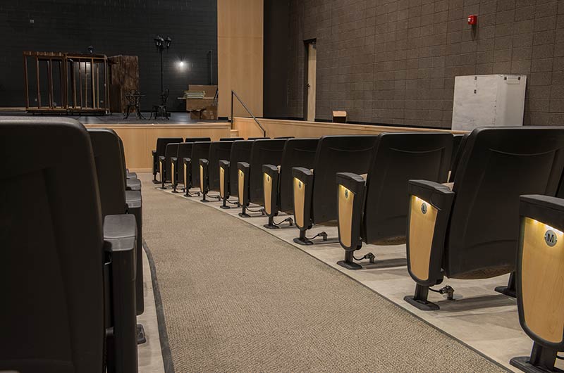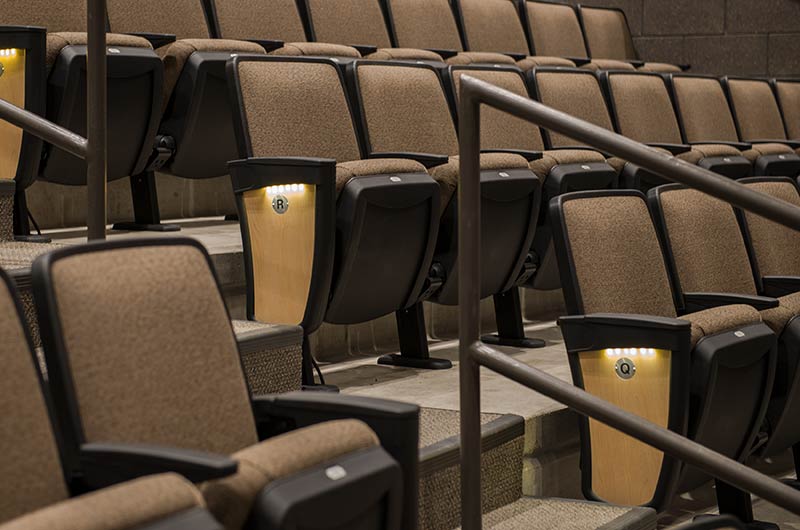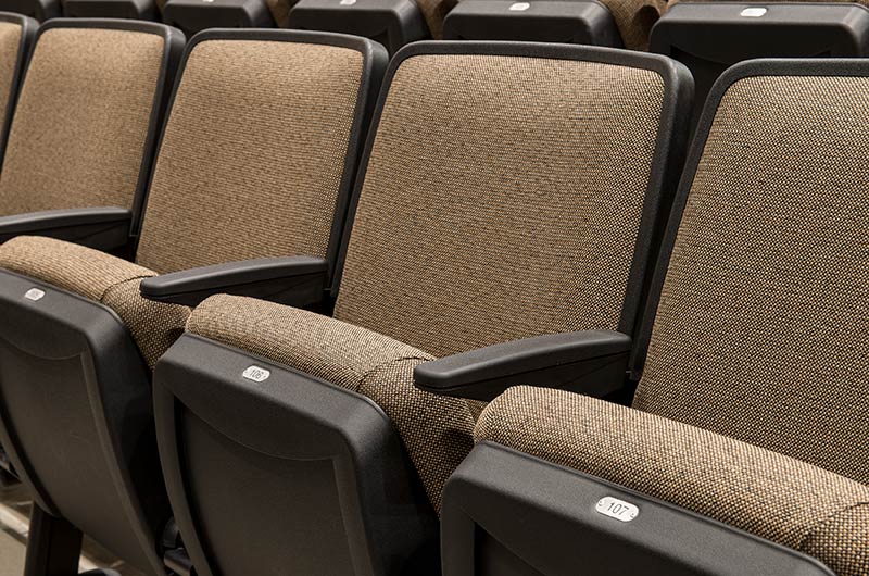 Williston High School opened in the Fall of 2016 with a 635 seat auditorium. Seating installed is our model 90.12.10.4 Citation. The theater chairs are provided with concealed LED aisle lights, row letter and seat number plates, rubber foot shrouds and comfort-curved polymer armrests. The No. 10 aisle insert panels are surfaced with Nevamar Clear Maple laminate and the backs and seats are upholstered in Absecon Mills Shire Hopsack.