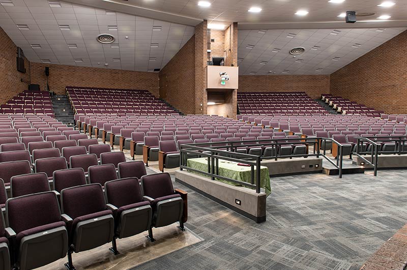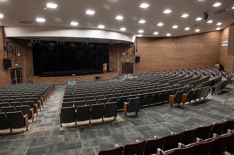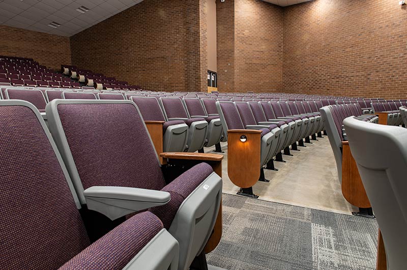 A 2017 expansion of Windsor High School included the partial reseat of the auditorium with 578 model 90.12.66.4 Citation chairs. These chairs were supplied with veneer surfaced aisle panels, solid hardwood aisle armrests, comfort curved polymer center arms, Beacon LED aisle lights and row letter/seat number plates. These chairs were finished with Cadet Grey plastic, Black powder coat (paint), No. 17 Teak on Red Oak, Absecon Mills Shire Country fabric.