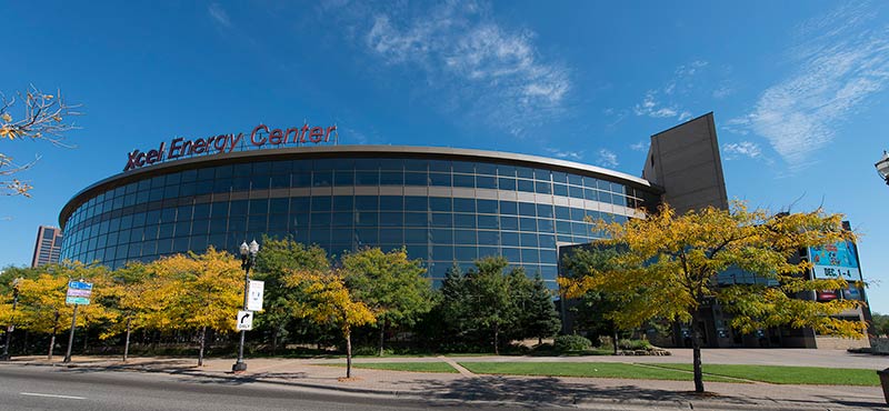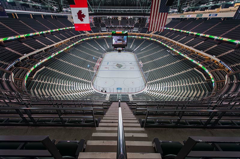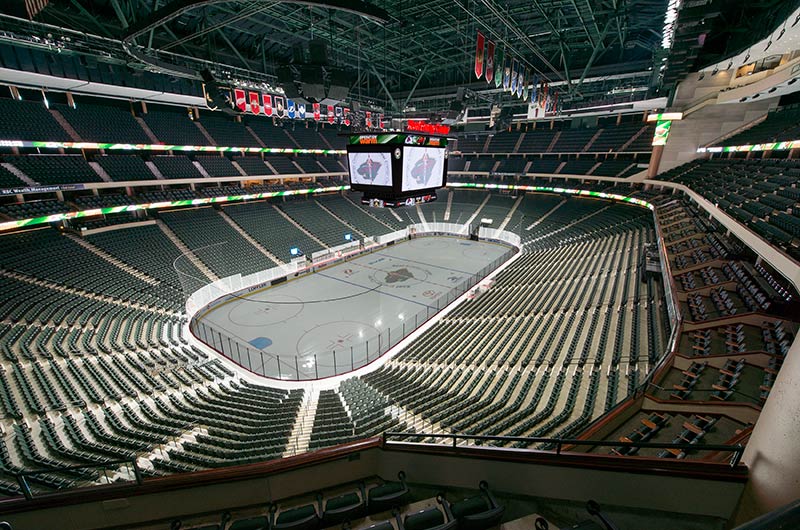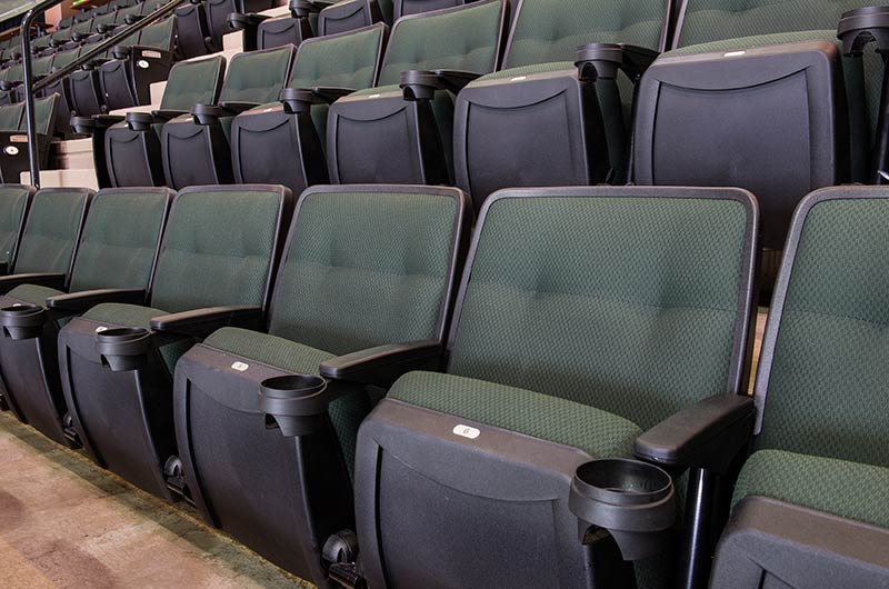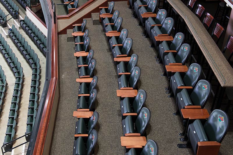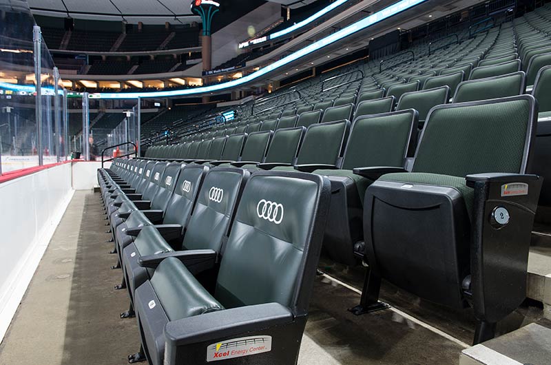 A 2016 renovation to the Xcel Energy Center included replacement of all 18,000 chairs in the arena. General seating sections are installed with model No. 90.12.20.4 Citation chairs. These areas feature our No. 20 cast iron aisle panel with bevelled row letter plate and a custom logo plate. Club areas are provided with tufted backs and our No. 12 loge seat with 4" foam. The Audi on the Glass club area is provided with embroidered logos. Suites are installed with Model 91.12.66.4 Millennium chairs with team logo embroidered on the backs, the No. 12 loge seat, comfort-curved wood arms and intermediate drink tables.