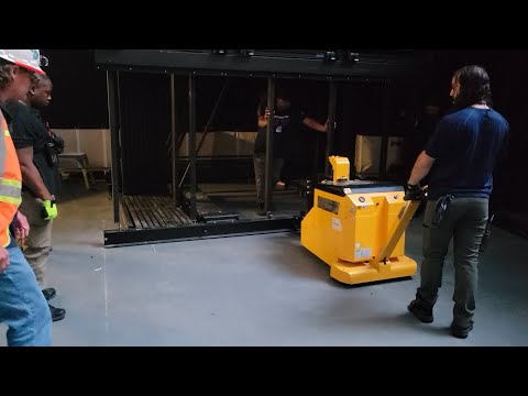 STEP 5. Remove from storage and roll them into place using the mover with help from others to steer and control the system. Use spotters to prevent harm to operators around doors and walls.
