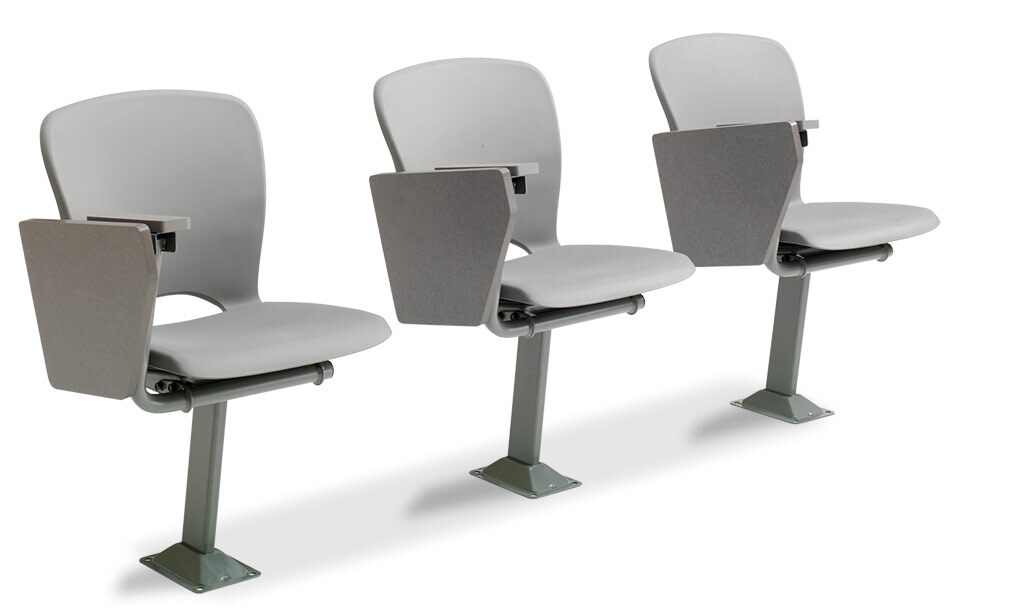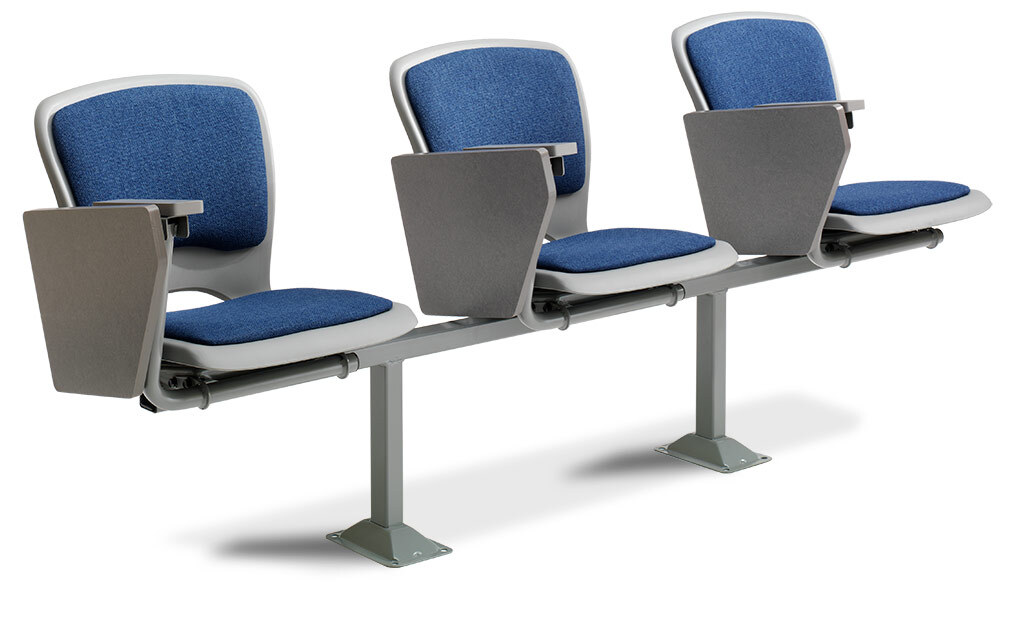 The No. 7.71 chair is designed with a padded & upholstered, one-piece polymer shell (No. 7) and a large self-storing writing tablet. It is available for floor mounting, riser mounting, and on a horizontal steel beam (floor mount only).