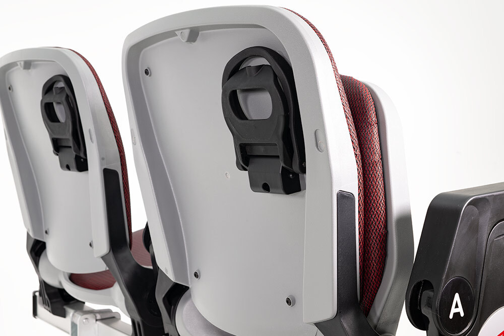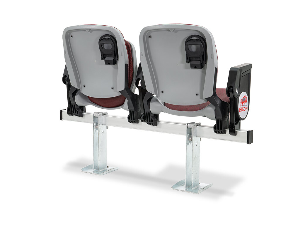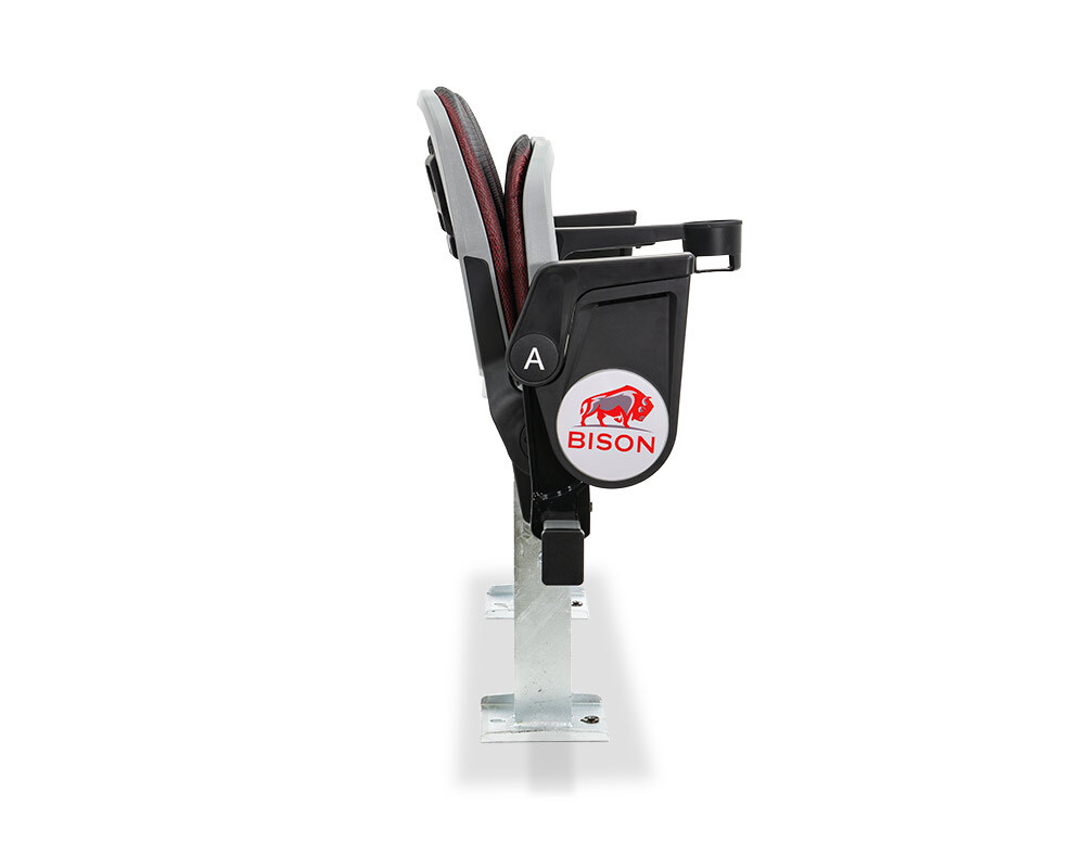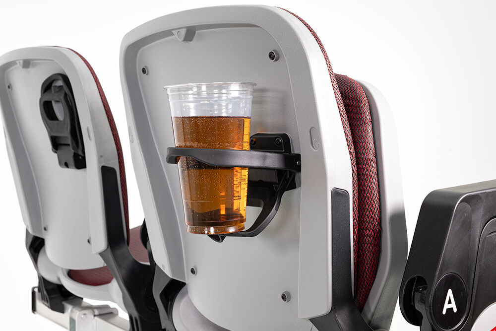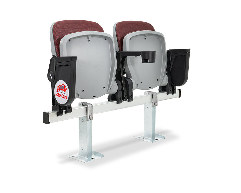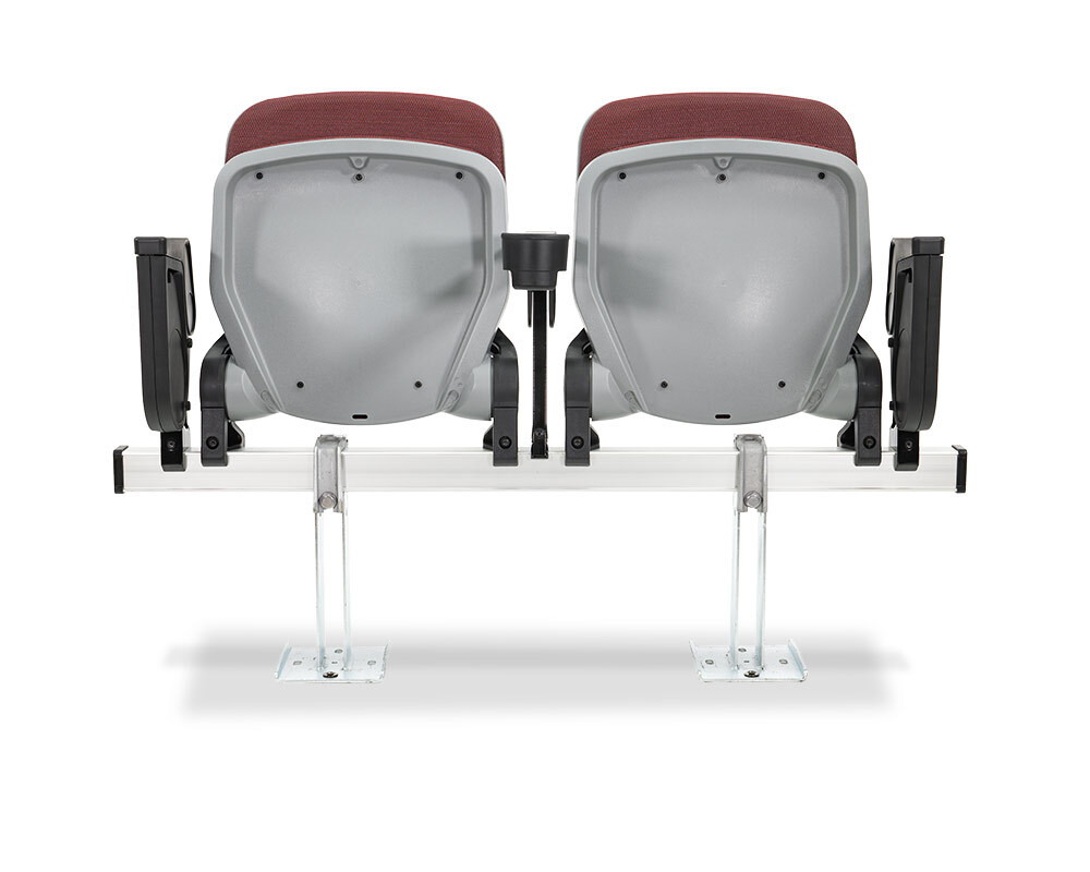 Centura is shown here with premium options that include a padded seat and back, rail mount aisle panel with screen printed logo plates, cupholder armrests for front row locations and our innovative rear mount flip-up cupholders. The seats and backs are upholstered in Diamondback fabric.